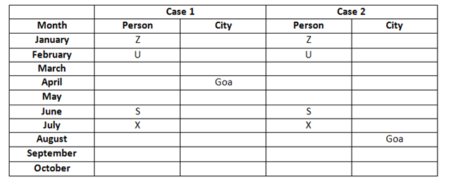 दस व्यक्ति- P, R, S, T, U, V, W, X, Y और Z जनवरी से शुरू होने और अक्टूबर को समाप्त होने वाले उसी वर्ष के 10 अलग-अलग महीनों में पैदा हुए हैं। उनमें से प्रत्येक अलग-अलग शहरों से संबंधित है, जैसे। चेन्नई, बैंगलोर, दिल्ली, कोलकाता, पुणे, पटना, मुंबई, हैदराबाद, शिलांग और गोवा, लेकिन एक ही क्रम में जरूरी नहीं है।