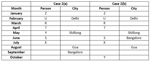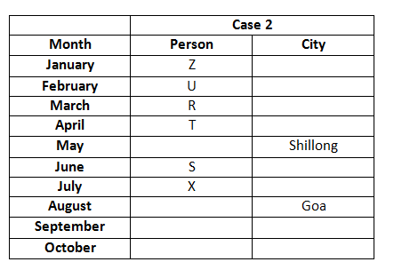 U का जन्म S से पहले महीने में से एक में हुआ था। केवल एक व्यक्ति हैदराबाद से संबंधित और पुणे से संबंधित व्यक्ति के बीच पैदा हुआ था। Z और X के बीच केवल पांच व्यक्ति पैदा हुए थे। केवल एक व्यक्ति गोवा से सम्बंधित और S के बीच पैदा हुआ था। केवल एक व्यक्ति R और शिलोंग से संबंधित एक व्यक्ति के बीच पैदा हुआ था। केवल तीन व्यक्ति Y और जो बैंगलोर से संबंधित है के बीच पैदा हुए थे। W और V के बीच केवल तीन व्यक्ति पैदा हुए थे। जो हैदराबाद से संबंधित है, वह चेन्नई से संबंधित व्यक्ति के ठीक पहले पैदा हुआ था। T और X के बीच केवल दो व्यक्ति पैदा हुए थे। दिल्ली से संबंधित व्यक्ति और शिलोंग से संबंधित व्यक्ति के बीच केवल दो व्यक्तियाँ पैदा हुआ था। S उस महीने में पैदा हुआ था, जिसमें 30 दिन हैं लेकिन अगस्त महीने से पहले। गोवा से संबंधित व्यक्ति और हैदराबाद से संबंधित व्यक्ति अप्रैल और मार्च के महीने में पैदा नहीं होता है। T के तुरंत बाद पैदा होने वाला शिलोंग से सम्बंधित है| Z जनवरी के महीने में पैदा हुआ था। पटना से संबंधित एक व्यक्ति W से पहले पैदा हुआ था। S और U के बीच केवल तीन व्यक्ति पैदा हुए थे| R मुंबई से संबंधित नहीं हैं। T, बैंगलोर से संबंधित व्यक्ति से पहले किसी एक महीने में पैदा हुआ था।