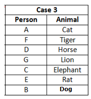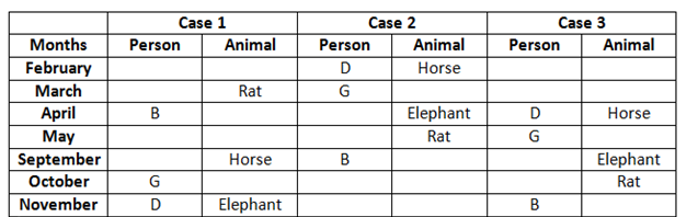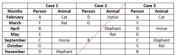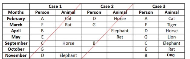 C और जो बिल्ली पसंद करते हैं के बीच केवल तीन लोगों की नियुक्ति होती है। जो चूहा पसंद करता है वह उस महीने में से एक पर नियुक्ति करता है जिसमें 31 दिन हैं। घोड़े को पसंद करने वाले व्यक्ति और हाथी को पसंद करने वाले व्यक्ति के बीच केवल एक व्यक्ति की नियुक्ति होती है। G और B के बीच केवल दो लोगों की नियुक्ति है। केवल दो व्यक्तियों की D और E के बीच नियुक्ति है। बिल्ली को पसंद करने वाले व्यक्ति की F से पहले नियुक्ति होती है। केवल दो लोगों की चूहा और घोड़े को पसंद करने वाले व्यक्ति के बीच नियुक्ति होती है। कुत्ते को पसंद करने वाले व्यक्ति से पहले व्यक्तियों की संख्या A के बाद नियुक्ति की संख्या समान है। B और D के बीच केवल तीन लोगों की नियुक्ति होती है G की नियुक्ति हाथी पसंद करने वाले व्यक्ति से तत्काल पहले होती है। शेर पसंद करने वाले से पहले महीने में बाघ पसंद करने वाले व्यक्ति की नियुक्ति होती है। F की उस महीने की नियुक्ति है जिसमें 31 दिन हैं लेकिन E से पहले होती है। हाथी पसंद करने वाले की नियुक्ति घोड़े को पसंद करने वाले व्यक्ति के बाद किसी एक महीने में होती है। B की नियुक्ति उस महीने में नहीं होती है जिसमें सबसे कम दिन हैं।