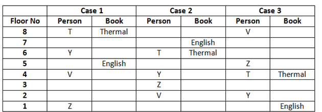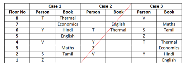 Y के नीचे रहने वाले व्यक्तियों की संख्या, गणित पसंद करने वाले व्यक्ति के ऊपर रहने वाले व्यक्तियों की संख्या के समान है। S तमिल किताब पसंद करता है और सम क्रमांकित मंजिल पर रहता है। थर्मल किताब पसंद करने वाले व्यक्ति के नीचे मंजिल की संख्या, Z के ऊपर मंजिल की संख्या के समान ही है। अंग्रेजी को पसंद करने वाले व्यक्ति की उपर रहने वाले व्यक्तिओ की संख्या V के नीचे रहने वाले व्यक्तियों की संख्या के समान है। केवल एक व्यक्ति T और Y के बीच रहता है। केवल तीन व्यक्ति S और जो हिंदी पसंद करते हैं के बीच रहते हैं। Z और जो अंग्रेजी पुस्तक पसंद करते हैं के बीच केवल तीन लोग रहते हैं। W और U के बीच केवल एक व्यक्ति रहता है। जो व्यक्ति इतिहास पसंद करता है वह किसी सम संख्या मंजिल पर रहता है। केवल तीन लोग V और T के बीच रहते हैं। U को अर्थशास्त्र पसंद नहीं है। जो थर्मल बुक पसंद करता है वह सम संख्या मंजिल पर रहता है| W के ऊपर के मंजिल में से एक पर इलेक्ट्रॉनिक्स पसंद करने वाला रहता है| Y T के नीचे के मंजिल में से एक पर रहता है। जो अर्थशास्त्र पसंद करता है वह तत्काल उस व्यक्ति से ऊपर रहता है जो हिंदी पसंद करता है।