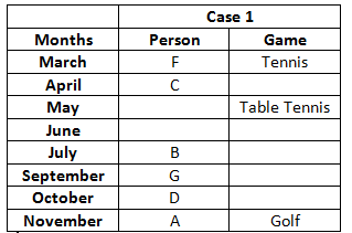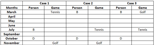 आठ दोस्तों- A, B, C, D, E, F, G और H समान वर्ष के मार्च, अप्रैल, मई, जून, जुलाई, सितंबर, अक्टूबर और नवंबर में आठ अलग-अलग महीनों में पैदा हुए हैं। उनमें से प्रत्येक को अलग-अलग खेल जैसे , क्रिकेट, फुटबॉल, हॉकी, गोल्फ, टेनिस, रग्बी, टेबल टेनिस और बैडमिंटन पसंद हैं, लेकिन एक ही क्रम में जरूरी नहीं है।