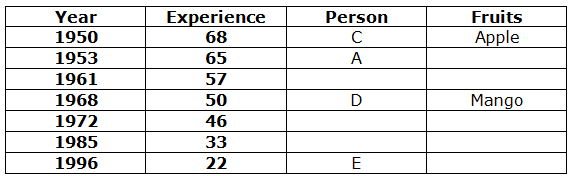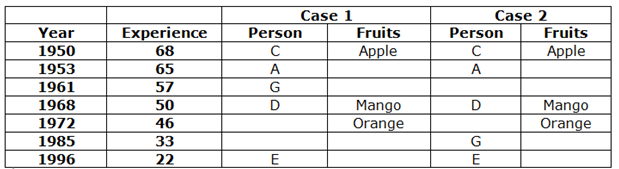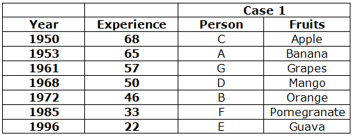 सात व्यक्ति- A, B, C, D, E, F और G सात अलग-अलग वर्षों, 1950, 1953, 1961, 1968, 1972, 1985 और 1996 के समान तारीख और समान महीने में एक कंपनी में शामिल होते। उनमें से प्रत्येक को अलग-अलग फल जैसे , आम, सेब, केला, अंगूर, अमरूद, नारंगी और अनार पसंद है, लेकिन एक ही क्रम में जरूरी नहीं है। उनका अनुभव 2018 के आधार पर गणना की गई।