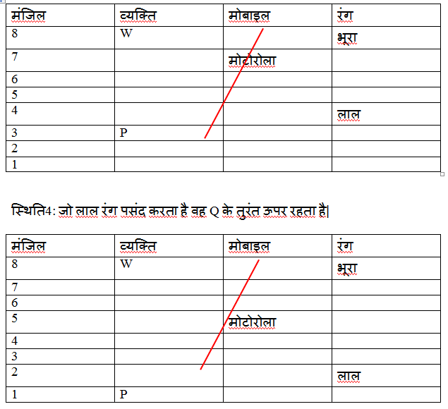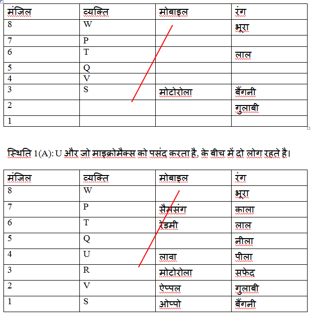 P और जो मोटोरोला को पसंद करता है के बीच तीन लोग रहते है।  जो लाल रंग पसंद करता है वह Q के तुरंत ऊपर रहता है। Q और जो कि गुलाबी रंग पसंद करते हैं के बीच में दो लोग रहते हैं । W भूरा रंग पसंद करते है और सबसे ऊपरी मंजिल में रहता है। जो लोग बैंगनी रंग पसंद करते हैं और जो लावा को पसंद करते हैं, उनके बीच दो लोग रहते है। P विषम क्रमांकित मंजिल में रहता है। T और जो कि गुलाबी रंग पसंद करते हैं के बीच में जितने लोग रहते हैं उतने ही लोग U और जो कि भूरा रंग पसंद करते हैं के बीच में रहते हैं। जो रेडमी  पसंद करता है वह काले रंग पसंद करने वाले व्यक्ति के तुरंत नीचे रहता है । V ना तो ओप्पो मोबाइल पसंद करता है और ना ही पीला रंग पसंद करता है। U और जो माइक्रोमैक्स को पसंद करता है, के बीच में दो लोग रहते है। R ,ऐप्पल मोबाइल पसंद करने वाले के तुरंत ऊपर रहता है। जो नीला रंग पसंद करता है और जो सैमसंग को पसंद करता है,उनके के बीच सिर्फ एक ही व्यक्ति रहता है। S बैंगनी रंग पसंद करता है और V के तुरंत नीचे रहता है। मोटोरोला को पसंद करने वाले और लाल रंग को पसंद करने वाले व्यक्ति के बीच दो लोग रहते है। ओप्पो और पीले रंग को पसंद करने वाले व्यक्ति के बीच दो लोग रहते है। जो मोटोरोला पसंद करता है वह नीला रंग पसंद नहीं करता।