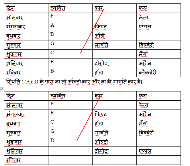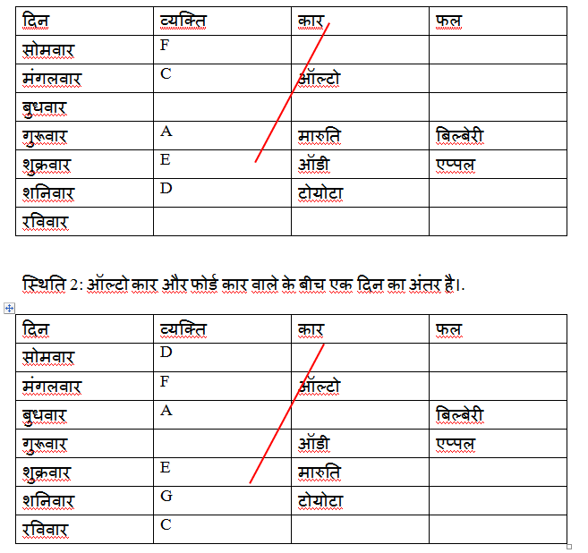 सोमवार से शुरू होने वाले सप्ताह के अलग-अलग दिनों में सात व्यक्ति A, B, C, D, E, F और G शॉपिंग करने के लिए जाते है। उनमें से प्रत्येक लोग अलग-अलग फल जैसे एप्पल, मैंगो, ऑरेंज, अंगूर, बिल्बेरी, केले और ब्लैकबेरी खरीदता है लेकिन जरूरी नहीं कि एक ही क्रम में। उनमें से प्रत्येक के पास अलग-अलग कार जैसे ऑडी, ऑल्टो, फिएट, फोर्ड, होंडा, मारुति और टोयोटा हैं, लेकिन जरूरी नहीं कि एक ही क्रम में।