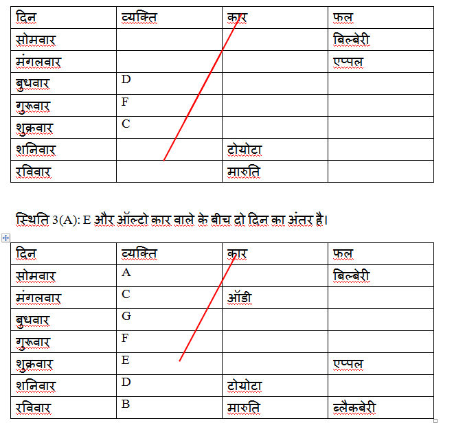 C और जो एप्पल खरीदता है के बीच दो दिन का अंतर है।  जिसकी ऑडी कार है वह A के तुरंत बाद. खरीदारी करने जाता है। F उस व्यक्ति से पहले शॉपिंग के लिए जाता है जिसके पास मारुति कार है। G और जो एप्पल खरीदता है के बीच एक दिन का अंतर है। C बिल्बेरी नहीं खरीदता है और इसके पास टोयोटा कार नहीं है। B को ब्लैकबेरी पसंद है। ऑरेंज फल और मैंगो फल क्रमागत दिनों में खरीदा गया। ऑल्टो कार और फोर्ड कार वाले के बीच एक दिन का अंतर है। D और बिल्बेरी  खरीदने वाले के बीच के दिनों की संख्या ,C और जिसके पास मारुति कार है के बीच के दिनों की संख्या  समान है। F के पास फिएट कार नहीं है। E और ऑल्टो कार वाले के बीच दो दिन का अंतर है। जिसके पास फिएट कार है वह केला खरीदारी करने वाले के तुरंत बाद शॉपिंग करने के लिए जाता है। जिसके पास मारुति कार है उसके के नीचे आने वाले दिनों की संख्या, बिल्बेरी की खरीद करने वाले के ऊपर आने वाले दिनों की संख्या के समान है। जिसके पास टोयोटा कार है वह शनिवार को शॉपिंग पर जाता है। D के पास ना तो ऑल्टो कार या और ना ही मारुति कार है। F और जिसकी मारुति कार है के बीच दो दिन का अंतर है।   जो  ऑरेंज खरीदता है वह जिसके पास होंडा कार है के तुरंत पहले खरीदारी करने के लिए जाता है।