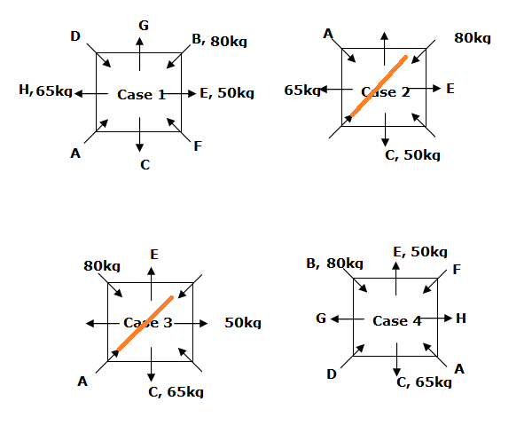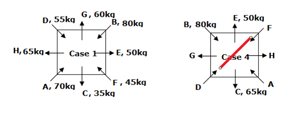 आठ व्यक्ति- A, B, C, D, E, F, G और H एक वर्गाकार मेज में बैठे हैं। उनमें से चार टेबल के कोने में बैठे हैं और केंद्र की और मुख किये है उनमें से चार मेज के बीच में बैठते हैं और टेबल के बाहर की ओर मुख किये है। उनमें से प्रत्येक के पास अलग वजन, 35 किलो, 45 किलो, 50 किलो, 55 किलो, 60 किलो, 65 किलो, 70 किलो और 80 किलो, हैं लेकिन एक ही क्रम में आवश्यक नहीं है।