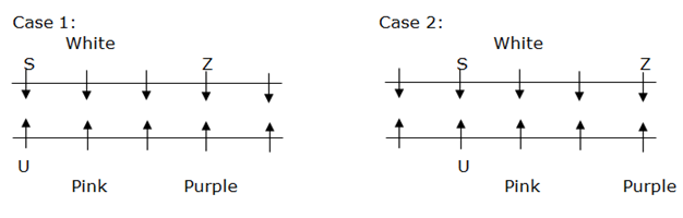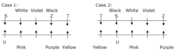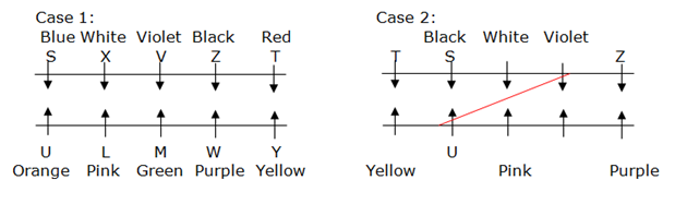 दस व्यक्ति- S, T, U, V, W, X, Y, L और M समानांतर पंक्ति में बैठे हैं। पंक्ति 1- S, T, V, X और Z दक्षिण में सामना कर रहे हैं। पंक्ति 2- L, M, U, W और Y उत्तर का सामना कर रहे हैं। पंक्ति 1 के प्रत्येक व्यक्ति पंक्ति 2 में व्यक्तियों का सामना कर रहे हैं. उनमें से प्रत्येक को अलग-अलग रंग, लाल, पीला, नारंगी, काला, सफेद, गुलाबी, बैंगनी, हरा, वायलेट और नीला, लेकिन एक ही क्रम में जरूरी नहीं है।