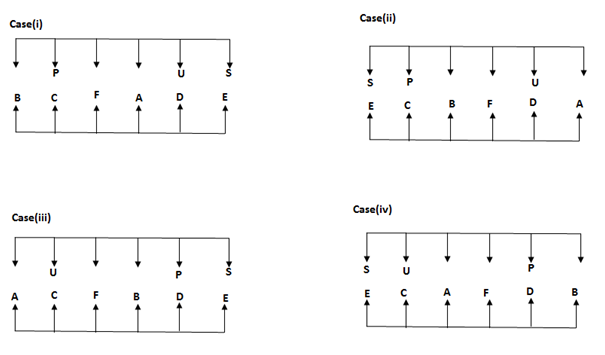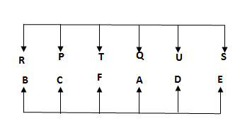 एक दूसरे के सामने समानांतर पंक्ति में बारह लोग बैठे है । पंक्ति 1: A, B, C, D, E और F उत्तर का सामना कर रहे हैं। पंक्ति 2: P, Q, R, S, T और U दक्षिण का सामना कर रहे हैं। सभी जानकारी एक ही क्रम में होना आवश्यक नहीं है।