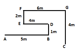 A B के 5 मीटर पश्चिम में खड़ा है| G C के 4 मीटर उत्तर में खड़ा है।F E के 2 मीटर उत्तर में खड़ा है। F G के 6 मीटर पश्चिम में खड़ा है B D के 1 मीटर दक्षिण में खड़ा है D E के 4 मीटर पूर्व में खड़ा है।