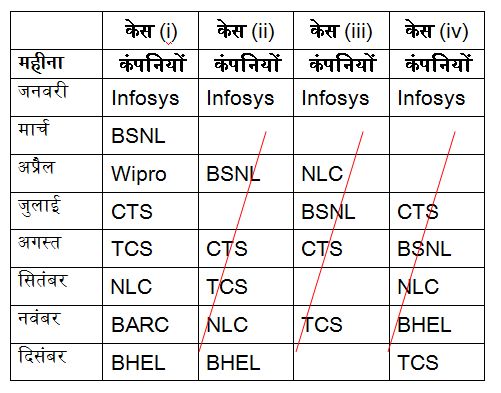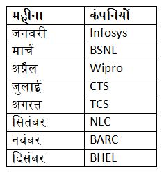 आठ कंपनियों ने एक वर्ष में एक महीने में अधिकतम लक्ष्य हासिल किया। कंपनियां BSNL, TCS, BARC, Wipro, Infosys, CTS, NLC और BHEL हैं। महीने दिसंबर, जनवरी, नवंबर, मार्च, अप्रैल, जुलाई, अगस्त और सितंबर हैं। सभी दी गई जानकारी एक ही क्रम में होने की आवश्यकता नहीं है।