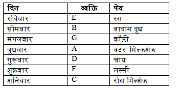एक सप्ताह में सात लोग A, B, C, D, E, F और G सात अलग-अलग दिनों में सात अलग-अलग पेय पी रहे हैं। पेय पदार्थ अर्थात् चाय, कॉफी, रोस मिल्शेक, बादाम मिल्कशेक, बटर मिल्कशेक, जूस और लस्सी हैं। सप्ताह के दिन रविवार से शनिवार तक होते हैं। सभी दी गई जानकारी एक ही क्रम में होने की आवश्यकता नहीं है।