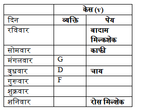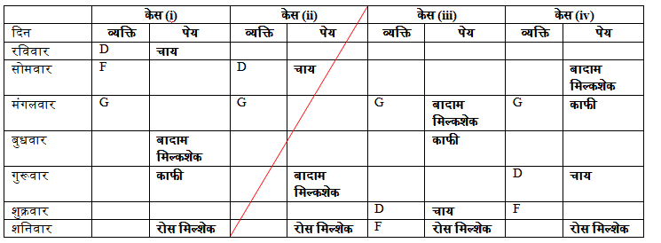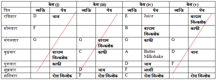5) यदि सभी व्यक्ति सप्ताह के पहले दिन से वर्णमाला क्रम में पेय पीते हैं। फिर उनमें से कितने मूल स्थिति में बने रहेंगे ?