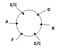 6) छह व्यक्ति A, B, C, D, E और F वृर्ताकार मेज में अंदर की ओर मुख किये हुआ बैठे हैं। निम्नलिखित व्यक्ति में से कौन सा A के दाईं ओर दूसरा बैठता है?