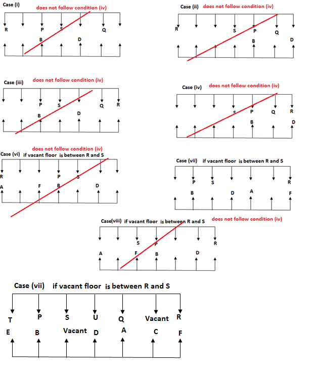कोई खाली जगह किसी अंतिम छोर पर नहीं हैं। F और E के बीच दो से अधिक व्यक्ति बैठते हैं, जो C के तत्काल पड़ोसी नहीं हैं। न तो R और न ही S C के सामना करते है। न तो S और न ही P खाली सीट का तत्काल पड़ोसी है। U और T तत्काल पड़ोसियाँ नहीं हैं। D T का सामना नहीं करता है