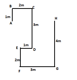 A B से 1 मीटर दक्षिण में है F G से 3 मीटर पश्चिम में है। B C से 2 मीटर पश्चिम में है H G से 4 मीटर उत्तर में है। E F से 2 मीटर उत्तर और D से 1 मीटर पश्चिम में है C D से 3 मीटर उत्तर में है।