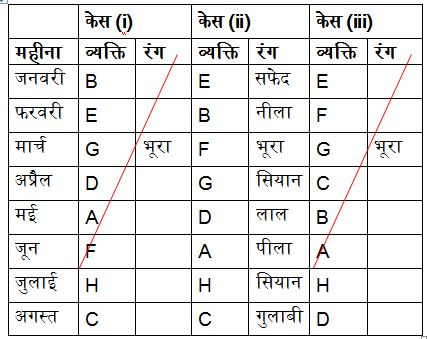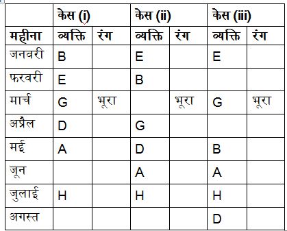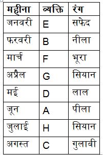 आठ लोग A, B, C, D, E, F, G और H आठ अलग-अलग महीनों में पैदा हुए हैं और वे सभी अलग-अलग रंग पसंद करते हैं। रंग लाल, नीला, हरा, गुलाबी, सायन, भूरा, सफेद और पीला हैं। महीने जनवरी से अगस्त तक हैं। सभी दी गई जानकारी एक ही क्रम में होने की आवश्यकता नहीं है। विचार करें कि सभी लोग समान वर्ष में पैदा हुए हैं।