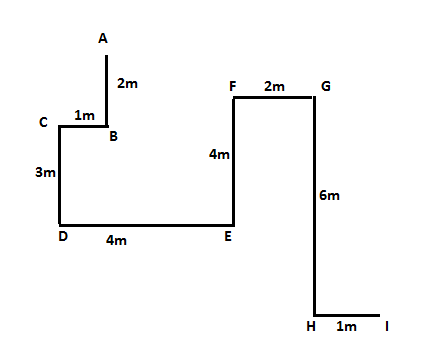 A B के 2 मीटर उत्तर में खड़ा है। D C के 3 मीटर दक्षिण में खड़ा है F E के 4 मीटर उत्तर में खड़ा है। E D के 4 मीटर पूर्व में खड़ा है। H I के 1 मीटर पश्चिम में खड़ा है| C B के 1 मीटर पश्चिम में खड़ा है। G H के 6 मीटर उत्तर में खड़ा है| F G के 2 मीटर पश्चिम में खड़ा है।