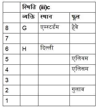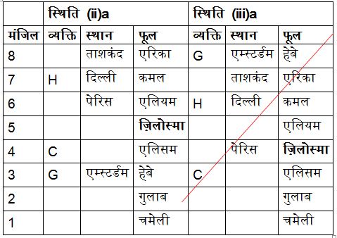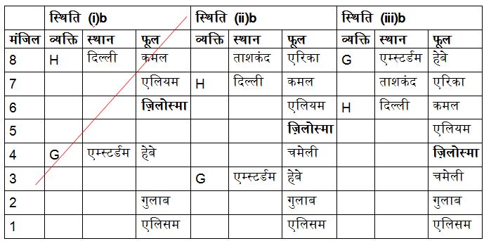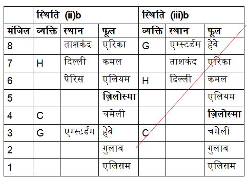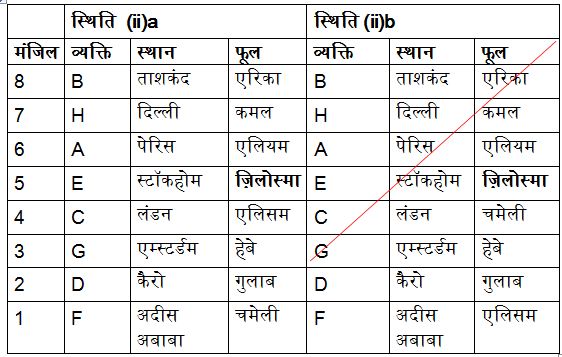 B, पेरिस से मौजूद व्यक्ति के ऊपर के मंजिल में से एक में रहता है। केवल तीन लोग C और उस व्यक्ति के बीच रहते हैं जो एरिका पसंद करता है। पेरिस से जो व्यक्ति हैं वह सम क्रमांकित मंजिल में रहता है। मंजिल संख्या 2 में रहने वाले व्यक्ति गुलाब पसंद करते हैं। G, हेबे फूल पसंद करता है और वह एम्स्टर्डम से है। H दिल्ली से है। एलिसाम पसंद करने वाला व्यक्ति मंजिल संख्या 5 के नीचे की मंजिल में से एक में रहता है। केवल दो लोग उस व्यक्ति के बीच रहते हैं जो एलियम को पसंद करता और एम्स्टर्डम से है। एलियम को पसंद करने वाला व्यक्ति मंजिल संख्या 5 से नीचे कोई मंजिल पर नहीं रहता है। वह व्यक्ति जो दिल्ली से है वह तत्काल उस व्यक्ति से ऊपर रहता है जो एलियम पसंद करता है। जो व्यक्ति कमल पसंद करता है वह उस व्यक्ति के नीचे कोई मंजिल में नहीं रहता है जो एलियम पसंद करता है। केवल एक व्यक्ति उस व्यक्ति के बीच रहता है जो कमल पसंद करता है और जो व्यक्ति ज़िलोस्मा पसंद करता है। ताशकंद से जो व्यक्ति हैं ज़िलोस्मा पसंद करने वाले के नीचे कोई मंजिल पर नहीं रहता है। F विषम संख्या वाली मंजिल में से एक रहता है, जो अदीस अबाबा से है। अदीस अबाबा से व्यक्ति ज़िलोस्मा पसंद नहीं करता है। अदीस अबाबा और पेरिस के व्यक्ति के बीच तीन से अधिक लोग रहते हैं। लंदन से व्यक्ति, स्टॉकहोम के व्यक्ति से तत्काल नीचे रहता है। E और D के बीच केवल दो लोग रहते हैं, जो ज़िलोस्मा पसंद नहीं करते हैं। लंदन से जो व्यक्ति न तो चमेली पसंद करता है और न ही एलियम पसंद करता है। ताशकंद से जो व्यक्ति हैं वह एरिका पसंद करता है।