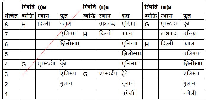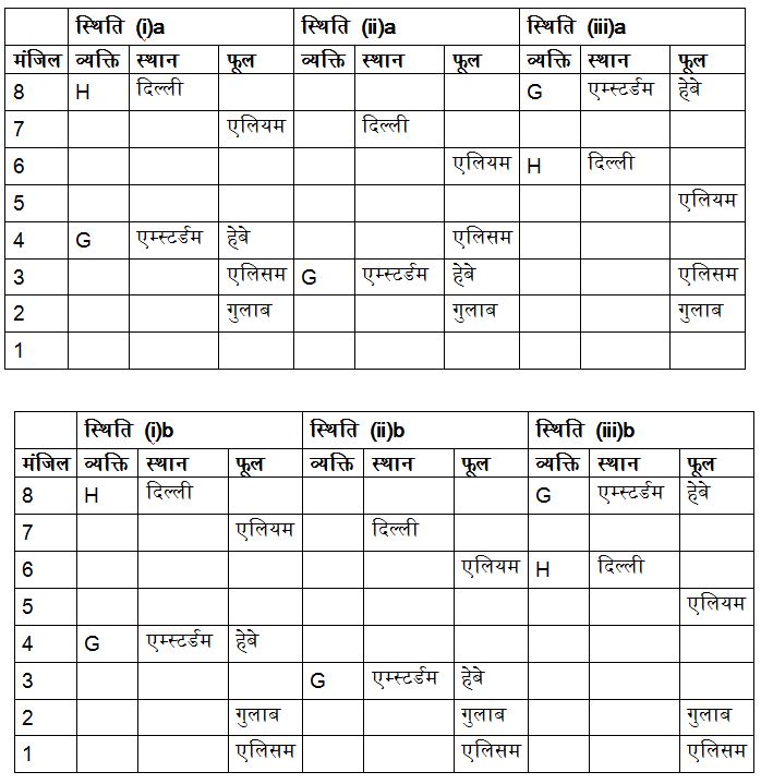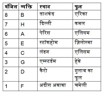 आठ लोग A, B, C, D, E, F, G और H आठ अलग-अलग स्थानों से हैं और वे सभी अलग-अलग फूल पसंद करते हैं। वे सभी एक अपार्टमेंट में आठ अलग-अलग मंजिलों में रहते हैं, निम्नतम मंजिल की संख्या एक है, इसकी उपरोक्त मंजिल दो गिना जाता है, और इसी तरह शीर्ष मंजिल की संख्या 8 तक है। स्थान दिल्ली, ताशकंद, एम्स्टर्डम, पेरिस, अदीस अबाबा, कैरो, स्टॉकहोम और लंदन। उनमें से प्रत्येक गुलाब, चमेली, ज़िलोस्मा, एलियम, एरिका, कमल, हेबे और एलिसम जैसे विभिन्न फूल पसंद करते हैं। सभी जानकारी एक ही क्रम में होने के लिए आवश्यक नहीं है।