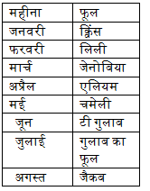 एक फूल विक्रेता आठ अलग-अलग महीनों में आठ अलग-अलग फूल बेच रहा है। फूल लिली, एलियम, गुलाब, टी गुलाब, जैकब, क्विंस, जेनोबिया और जैस्मीन हैं। महीने जनवरी से अगस्त तक शुरू हुए। सभी जानकारी एक ही क्रम में होने के लिए आवश्यक नहीं है।