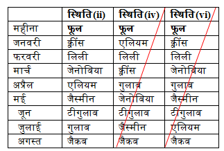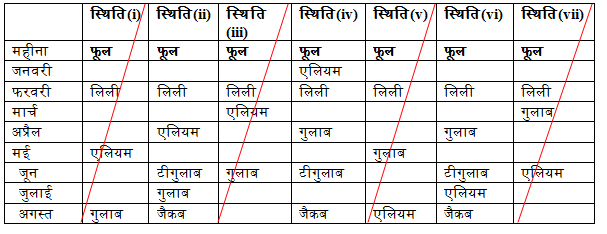 विक्रेता फरवरी के महीने में लिली फूल बेच रहा है। विक्रेता एलियम औरगुलाब के बीच केवल दो फूल बेच रहा है, जो लिली से पहले नहीं बेच रहा है। विक्रेता जैकब को उस महीने में बेच रहा है जिसमें 31 दिन हैं। जैकब और टीगुलाब के बीच केवल एक फूल बेच रहा है, जो कि उस महीने में बिक रहा है, जिसमें 31 दिनों से कम है। एक विक्रेता क्वींस और जैस्मीन के बीच दो से अधिक फूल बेच रहा है, जो जेनोबिया के बाद किसी एक दिन बेच रहा है। विक्रेता लगातार महीनों में जैस्मीन और जैकब नहीं बेच रहा है। गुलाब और जेनोबिया के बीच दो से अधिक फूल बेच रहे हैं।