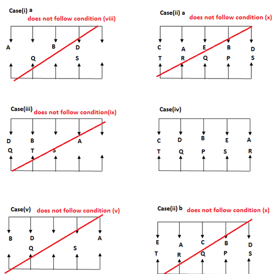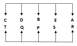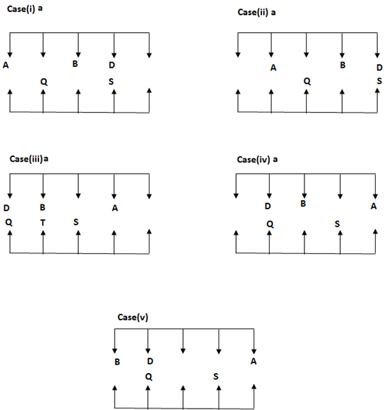 दस लोगएक दूसरे का सामना करते हुए दो समांतर पंक्तियों में बैठे हैं |पंक्ति 1 में: A, B, C, D और E दक्षिण का सामना कर रहे हैं। पंक्ति 2 में: P, Q, R, S और T उत्तर का सामना कर रहे हैं। सभी जानकारी एक ही क्रम में होने के लिए आवश्यक नहीं है।