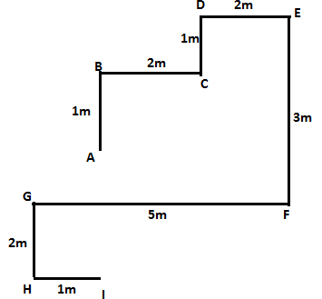 A B का 1 मीटर दक्षिण में खड़ा है| G Fके 5 मीटर पश्चिम में खड़ा है। I H के1 मीटर पूर्व में खड़ा है। D E के2 मीटर पश्चिम में खड़ा है। F E के 3 मीटर दक्षिण में खड़ा है| C B के 2 मीटर पूर्व में खड़ा है| D C का 1 मीटर उत्तर में खड़ा है। G H के 2 मीटर उत्तर मेंखड़ा है|