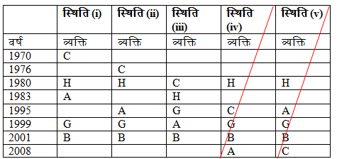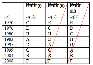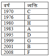 आठ लोग A, B, C, D, E, F, G और H आठ अलग-अलग वर्षों में नौकरी में शामिल होने की हैं जैसे 1970, 1980, 1999, 1976, 1983, 1995, 2001 और 2008. सभी जानकारी जरूरी नहीं है एक ही क्रम में होना है।