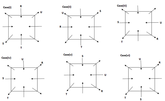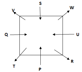आठ व्यक्ति P, Q, R, S, T, U, V, और W वर्गाकार टेबल में बैठे हैं, इस तरह से की जो टेबल के कोने पर बैठता है वह टेबल के बाहर का सामना करता है, जो व्यक्ति मध्य में बैठता है वह टेबल के अंदर का सामना करता है। सभी जानकारी एक ही क्रम में होने के लिए आवश्यक नहीं है।