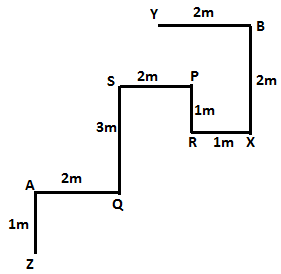A Z के 1 मीटर उत्तर में खड़ा है। R X के 1 मीटर पश्चिम में खड़ा है| B Y के 2 मीटर पूर्व में खड़ा है। X B के 2 मीटर दक्षिण में खड़ा है| S P के 2 मीटर पश्चिम में खड़ा है, जो R के 1 मीटर उत्तर में खड़ा है| Q S के 3 मीटर दक्षिण में खड़ा है| A Q के 2 मीटर पश्चिम में खड़ा है|