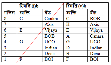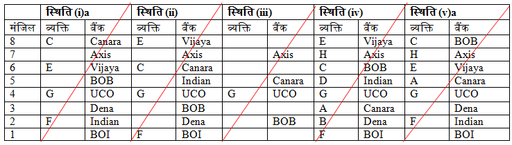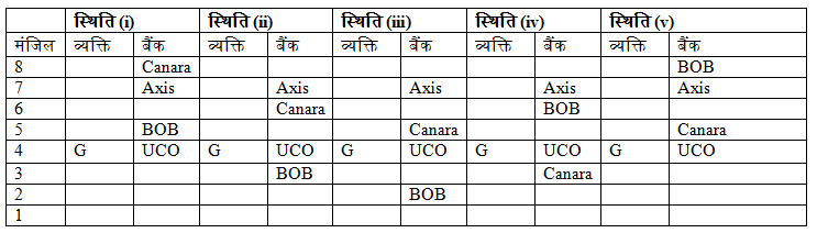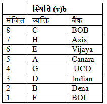 आठ लोग A, B, C, D, E, F, G और H इमारत में आठ अलग-अलग मंजिल में रह रहे हैं। प्रत्येक व्यक्ति आठ अलग-अलग बैंकों, Canara, Indian, UCO, BOB, Dena, BOI, Axis और Vijaya में काम कर रहा है। सबसे निचली मंजिल की संख्या एक है, इसकी उपरोक्त मंजिल दो और इसी प्रकार शीर्ष मंजिल तक। सभी जानकारी एक ही क्रम में होने की आवश्यकता नहीं है।