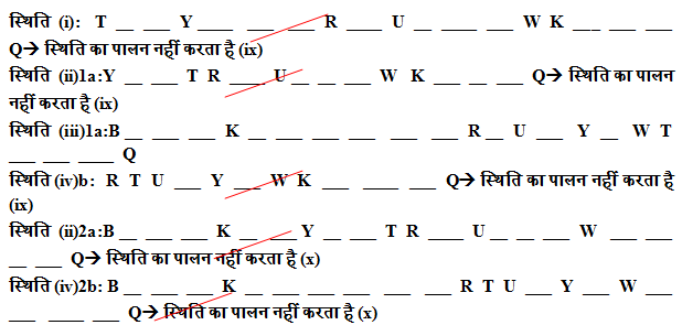 दक्षिण की ओर मुख किए सीधी रेखा में बैठे व्यक्ति की एक निश्चित संख्या है। T और Y के बीच केवल दो व्यक्ति बैठते हैं। Y और R के बीच केवल तीन व्यक्ति बैठे हैं |U R के बाईं ओर दूसरे स्थान पर बैठता हैं। U और Q के बीच केवल आठ व्यक्ति बैठे हैं| W Q के दाईं ओर पांचवें स्थान पर बैठता हैं। W और U के बीच तीन से अधिक व्यक्ति नहीं बैठे है| R और K के बीच छह व्यक्ति बैठे हैं| B K के दाहिने ओर चौथे स्थान पर बैठता हैं। B और R के बीच चार से अधिक व्यक्ति बैठते हैं। पंद्रह व्यक्ति से अधिक B और T के बीच बैठते हैं।