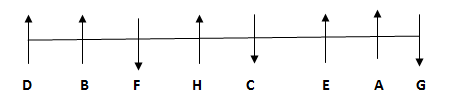 i). F sits second to the right of D, who sits at extreme end of the line.