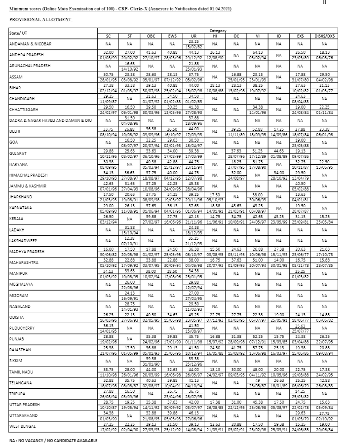 Minimum Scores out of 100 in the Respective States and UT’s: