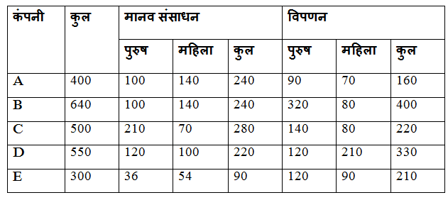 E: कंपनी E में कर्मचारियों की कुल संख्या कंपनी B के विपणन विभाग में काम करने वाले कर्मचारियों की संख्या का 75% है मानव संसाधन विभाग में कर्मचारियों का 30% काम करता है। मानव संसाधन और विपणन विभाग के पुरुष और महिला कर्मचारियों का अनुपात क्रमशः 2: 3 और 4: 3 है।