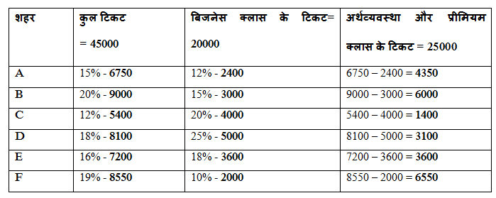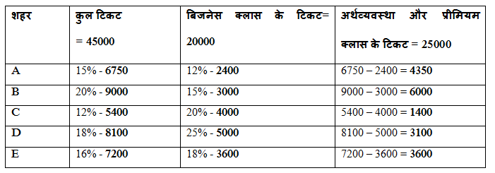 मात्रा I: उस शहर में बुक किए गए प्रीमियम क्लास के टिकट ज्ञात कीजिये, जो दिए गए शहरों में बिजनेस क्लास के अलावा बुक किए गए टिकटों की सबसे अधिक संख्या है, अगर इकोनॉमी क्लास और प्रीमियम क्लास का अनुपात 70: 61 है