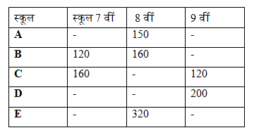 दी गई तालिका पाँच अलग-अलग स्कूलों में तीन वर्गों अर्थात् 7 वीं, 8 वीं और 9 वीं में छात्रों की संख्या को दर्शाती है। तालिका में कुछ डाटा लुप्त हैं।