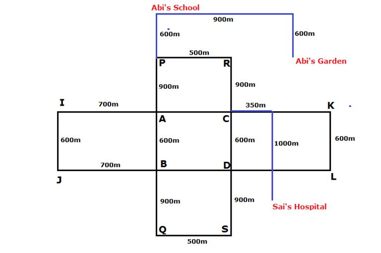 Abi walk from point I towards east direction and After walking 700m he takes left turn and walk 1500m to reach his school. Then he takes right turn and walk 0.9km to reach his house. Finally he moves 0.6km towards south to reach his garden.