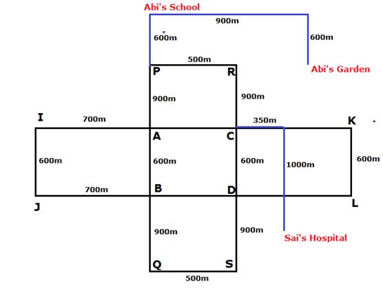 c) आमिर बिंदु S से उत्तर की ओर 400 मीटर चलता है और फिर वह बाएं मुड़ता है और 500 मीटर चलता है और फिर वह दायाँ मोड़ लेता है और 1 किमी चलता है और अंत में वह दायाँ मोड़ लेता है और बिंदु I तक पहुँचने के लिए 700 मीटर चलता है|