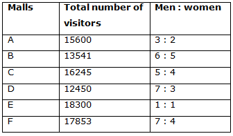 The following table shows the total number of peoples visiting the six different malls and the ratio of men and women who are all visiting the malls among them.