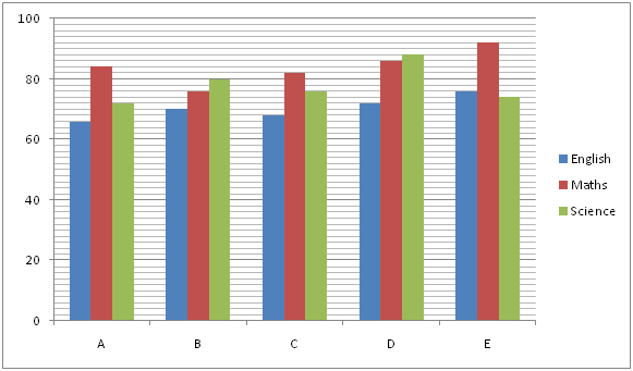 The following bar graph shows the unit test marks of 3 subjects of 5 different students. (Out of 100)
