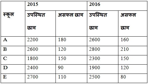 निम्नलिखित तालिका से पता चलता है कि छात्रों की कुल संख्या दो अलग-अलग वर्षों में विभिन्न स्कूलों की अंतिम परीक्षा में उपस्थित और असफल रहें ।