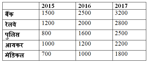 7) वर्ष 2015 में बैंक और मेडिकल विभाग में कर्मचारियों की कुल संख्या और वर्ष 2015 में रेलवे और आयकर विभाग में कर्मचारियों की कुल संख्या के बीच अंतर ज्ञात कीजिए?