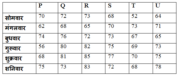 सप्ताह के सभी दिए गए दिनों में U को प्राप्त कुल औसत अंक