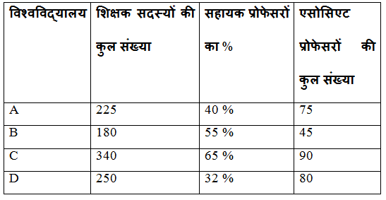 7) विश्वविद्यालय C में प्रोफेसरों की कुल संख्या, विश्वविद्यालय B और D में एसोसिएट प्रोफेसरों की कुल संख्या के बीच अनुपात ज्ञात कीजिए?