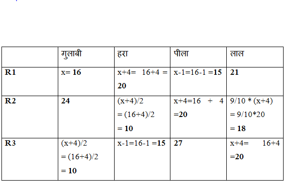 लाल बोतलों की संख्या में R3 = 20 = x+4 => x = 20-4