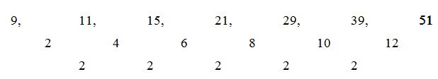 13 + 2 = 15, 15 + 4 = 19, 19 + 6 = 25