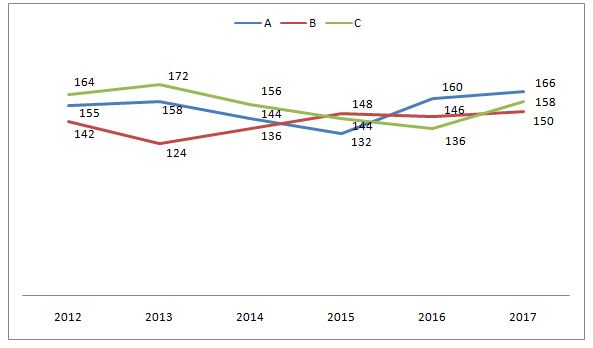 6) वर्ष 2012, 2014 और 2016 में A द्वारा संचालित कुल परियोजनाओं, 2013, 2015 और 2017 में C द्वारा संचालित कुल परियोजनाओं के बीच अंतर ज्ञात कीजिये?