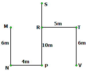 Point N is 6m to the south of point M. Point S is 10m to the north of point P, which is 4m to the east of point N. Point T is 6m to the north of point V. Point R is 5m to the west of point T and is 4m to the south of point S.