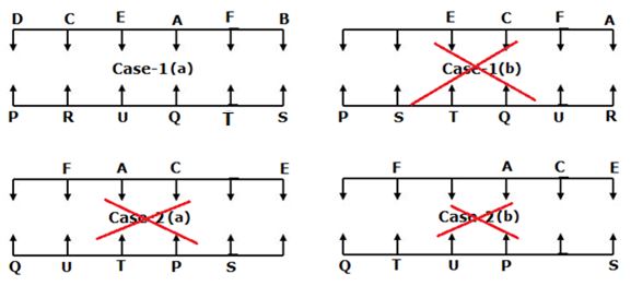 Twelve persons A, B, C, D, E, F, P, Q, R, S, T and U are sitting in two parallel rows with equidistance from each other. In Row-1, A, B, C, D, E and F are sitting and all of them are facing south and in Row-2, P, Q, R, S, T and U are sitting and all of them are facing north but not necessary in the same order.